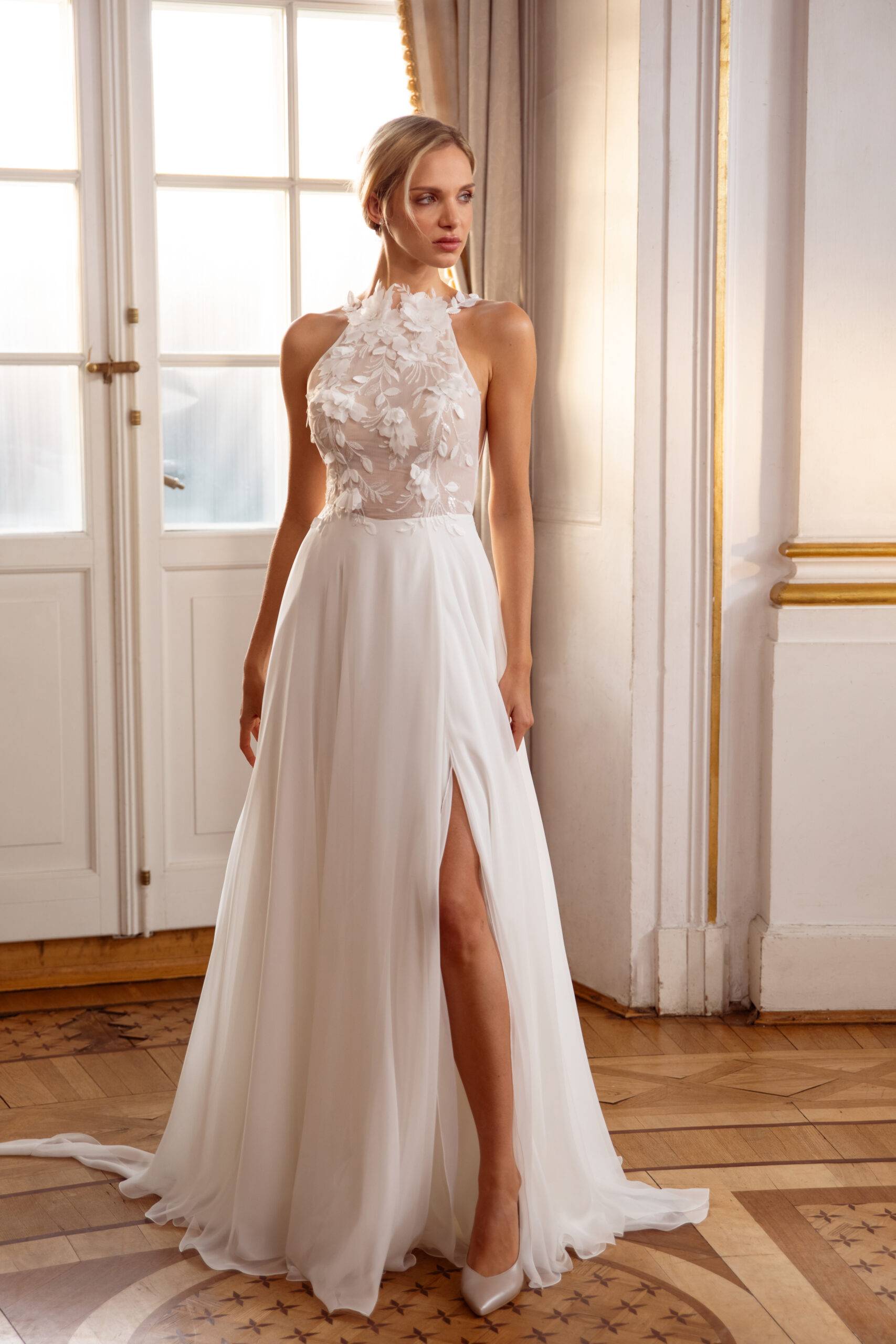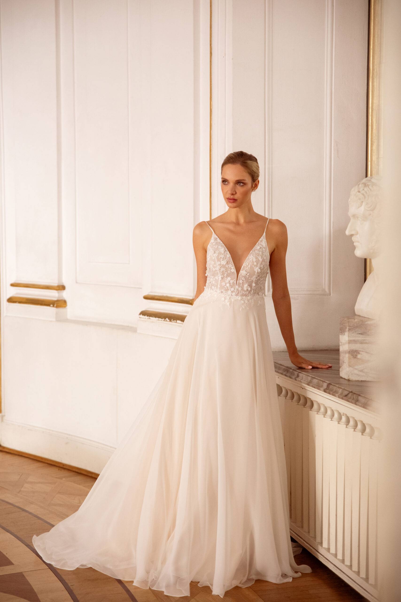 Die perfekt geschnittenen Oberteile bestehen aus Spitze und Crepe gehen in zarte und fließende Röcke über, die die Figur zart umspielen.